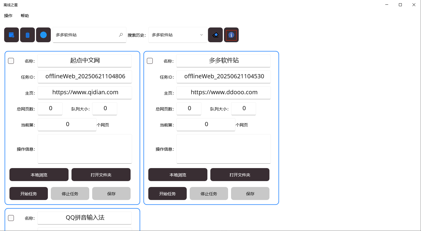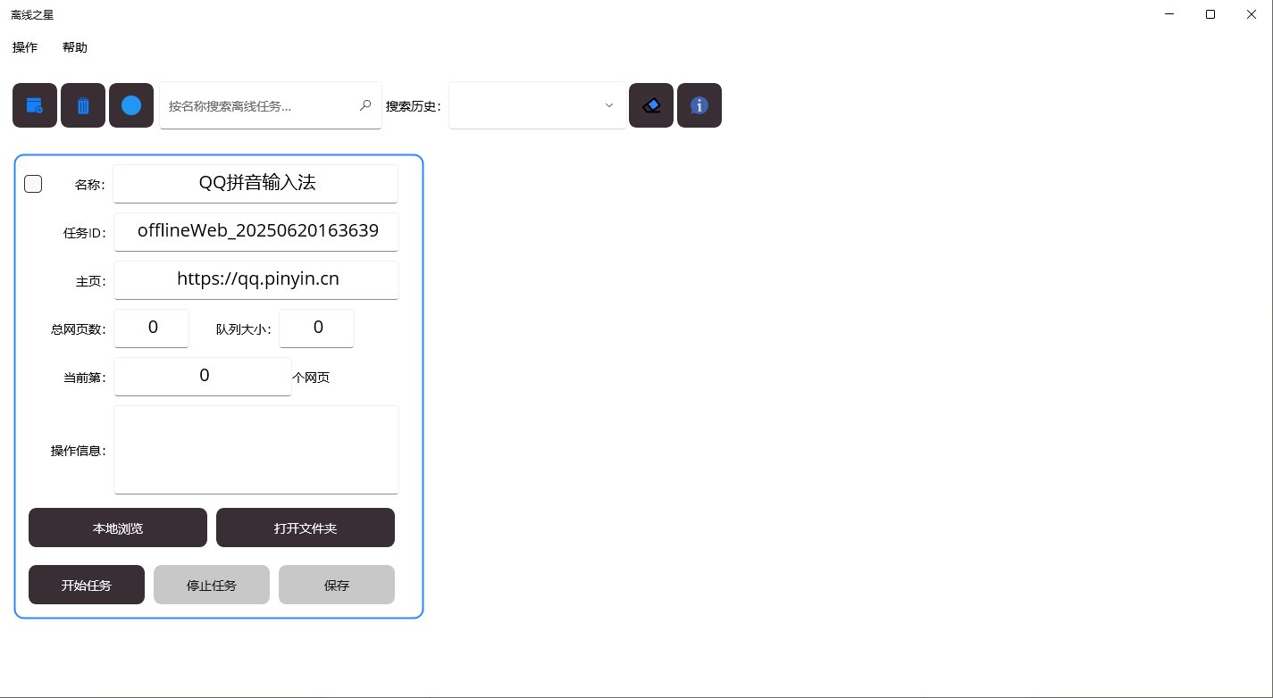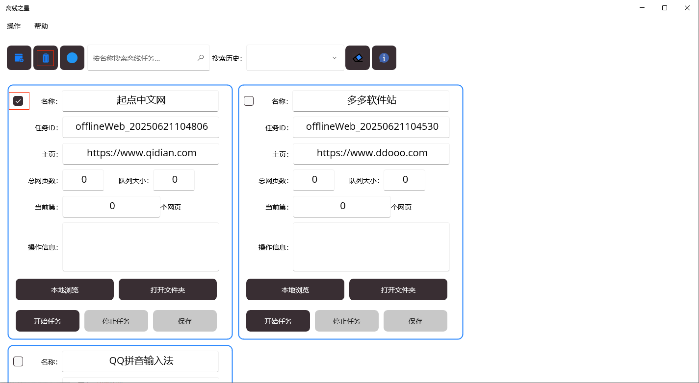 选中任务左上角的复选框,然后点击工具栏的”删除任务”按钮可以删除该任务并删除任务相关的配置文件、网址数据、下载的离线网页文件等。