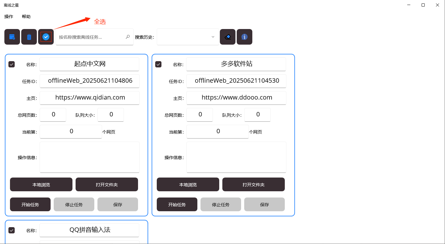 点击”全选”按钮可以批量选中任务,然后点击”删除任务”按钮则可以批量删除被选中的任务。