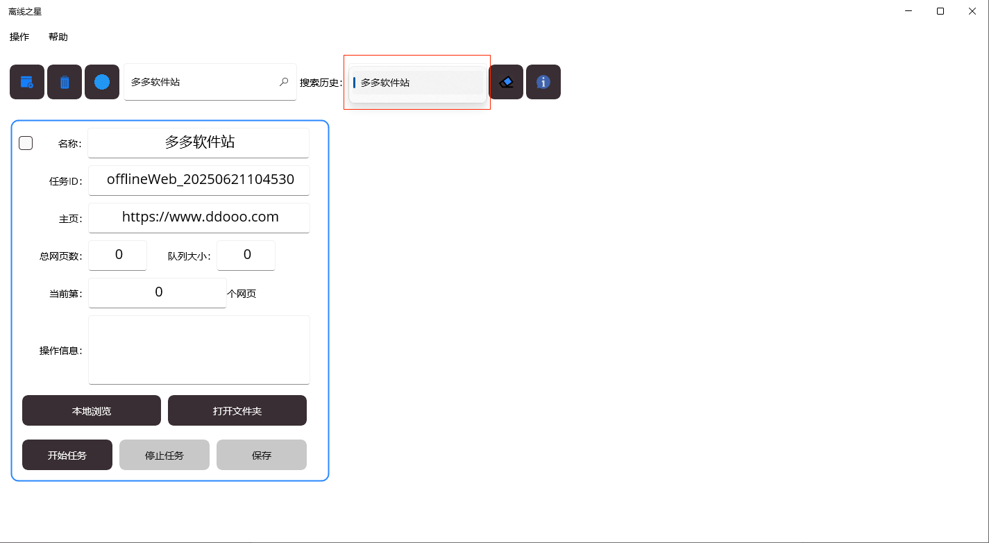每次搜索后会在”搜索历史”选择框中添加一条关键字记录,这样可以方便快速的选择历史记录,然后重新搜索任务。